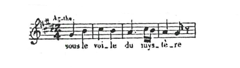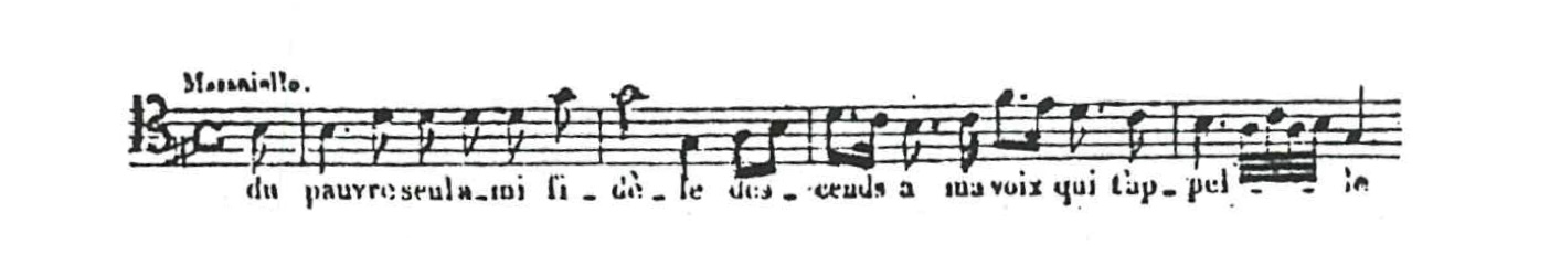 “The choice of timbre will never depend on the literal meaning of the words, but on the movements of the soul that dictate them. Feelings that are at once gentle and languorous, or again feelings that are energetic but restrained, do not go beyond the range of covered timbres. For example: in prayer, timidity, tenderness, the voice must be touching and slightly covered. Sometimes the sound of the breath is mingled with it in tenderness. Examples:”